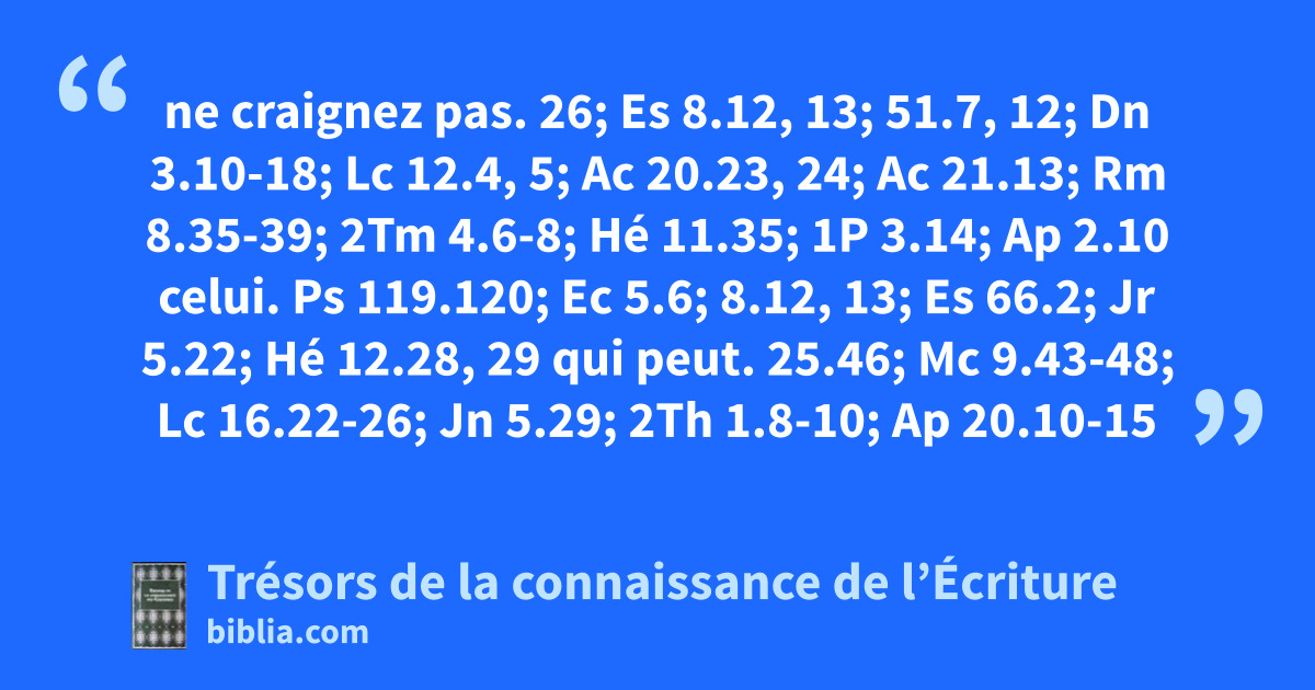 ne craignez pas. 26; Es 8.12, 13; 51.7, 12; Dn 3.10-18; Lc 12.4, 5; Ac 20.23, 24; Ac 21.13; Rm 8.35-39; 2Tm 4.6-8; Hé 11.35; 1P 3.14; Ap 2.10 celui. Ps 119.120; Ec 5.6; 8.12, 13; Es 66.2; Jr 5.22; Hé 12.28, 29 qui peut. 25.46; Mc 9.43-48; Lc 16.22-26; Jn 5.29; 2Th 1.8-10; Ap 20.10-15