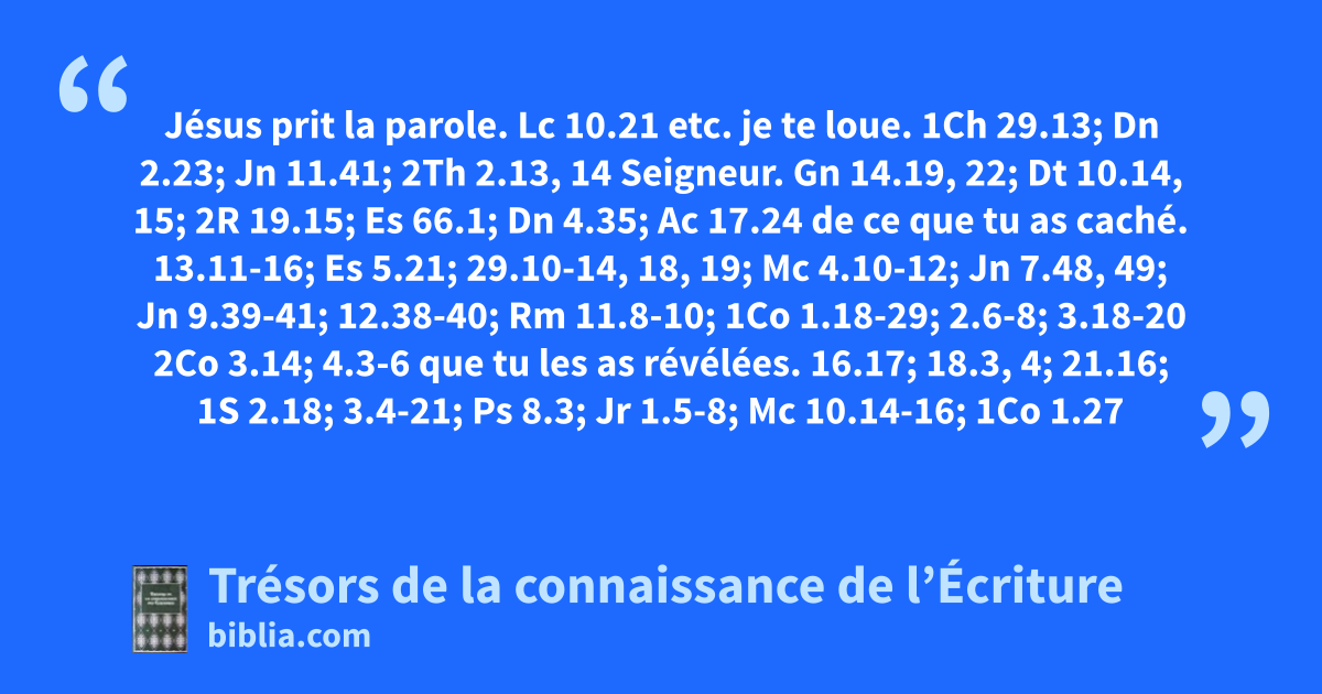 Jésus prit la parole. Lc 10.21 etc. je te loue. 1Ch 29.13; Dn 2.23; Jn 11.41; 2Th 2.13, 14 Seigneur. Gn 14.19, 22; Dt 10.14, 15; 2R 19.15; Es 66.1; Dn 4.35; Ac 17.24 de ce que tu as caché. 13.11-16; Es 5.21; 29.10-14, 18, 19; Mc 4.10-12; Jn 7.48, 49; Jn 9.39-41; 12.38-40; Rm 11.8-10; 1Co 1.18-29; 2.6-8; 3.18-20 2Co 3.14; 4.3-6 que tu les as révélées. 16.17; 18.3, 4; 21.16; 1S 2.18; 3.4-21; Ps 8.3; Jr 1.5-8; Mc 10.14-16; 1Co 1.27