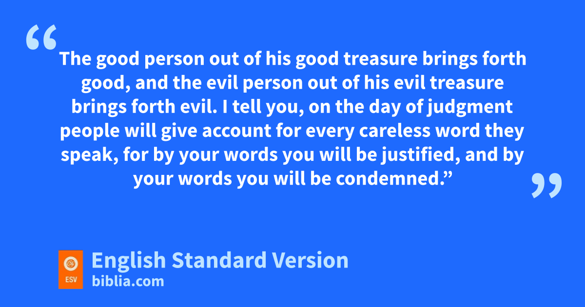 33 n“Either make the tree good and its fruit good, or make the tree bad and its fruit bad, ofor the tree is known by its fruit. 34 pYou brood of vipers! How can you speak good, qwhen you are evil? rFor out of the abundance of the heart the mouth speaks. 35 rThe good person out of his good treasure brings forth good, and the evil person out of his evil treasure brings forth evil. 36 I tell you, son the day of judgment tpeople will give account for uevery careless word they speak, 37 for vby your words you will be justified, and by your words you will be condemned.”
