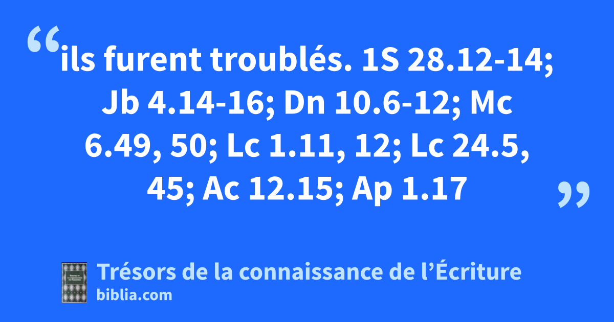 ils furent troublés. 1S 28.12-14; Jb 4.14-16; Dn 10.6-12; Mc 6.49, 50; Lc 1.11, 12; Lc 24.5, 45; Ac 12.15; Ap 1.17