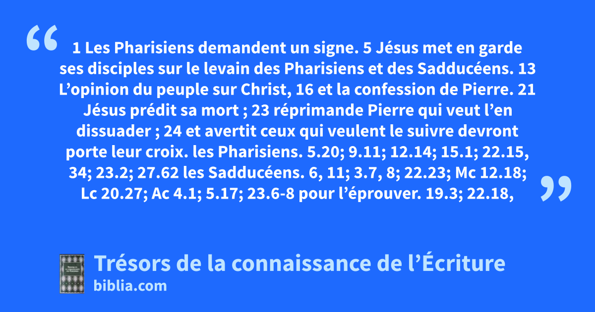 les Pharisiens. 5.20; 9.11; 12.14; 15.1; 22.15, 34; 23.2; 27.62 les Sadducéens. 6, 11; 3.7, 8; 22.23; Mc 12.18; Lc 20.27; Ac 4.1; 5.17; 23.6-8 pour l’éprouver. 19.3; 22.18, 35; Mc 10.2; 12.15; Lc 10.25; 11.16, 53, 54; 20.23; Jn 8.6 un signe. 12.38, 39; Mc 8.11-13; Lc 11.16, 29, 30; 12.54-56; Jn 6.30, 31 1Co 1.22