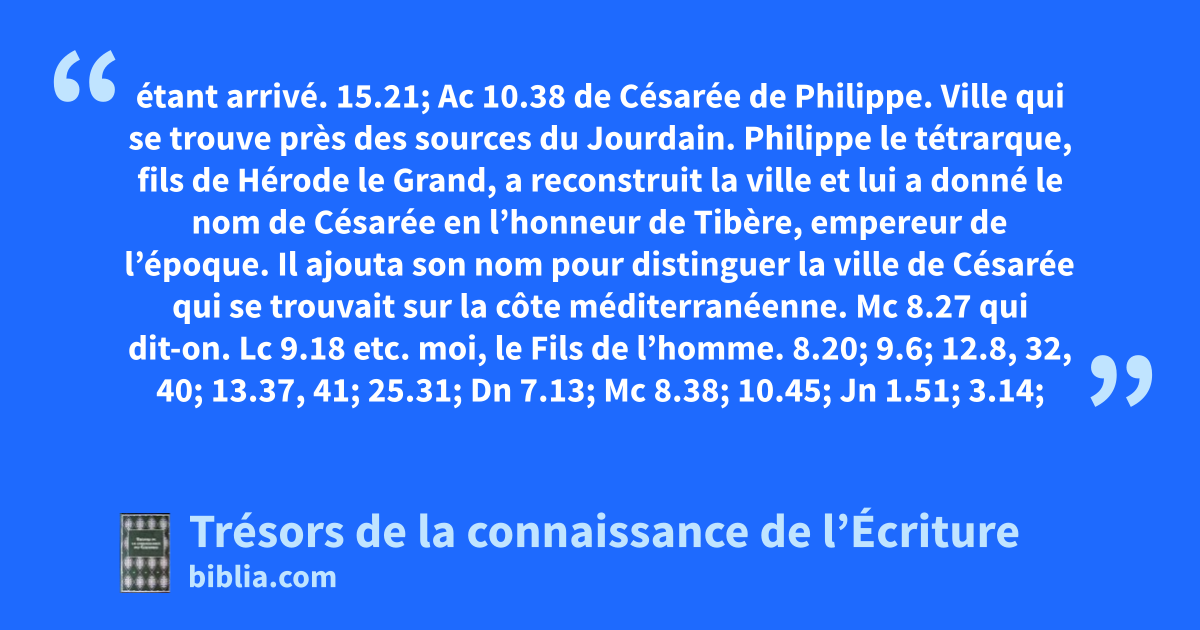 étant arrivé. 15.21; Ac 10.38 de Césarée de Philippe. Ville qui se trouve près des sources du Jourdain. Philippe le tétrarque, fils de Hérode le Grand, a reconstruit la ville et lui a donné le nom de Césarée en l’honneur de Tibère, empereur de l’époque. Il ajouta son nom pour distinguer la ville de Césarée qui se trouvait sur la côte méditerranéenne. Mc 8.27 qui dit-on. Lc 9.18 etc. moi, le Fils de l’homme. 8.20; 9.6; 12.8, 32, 40; 13.37, 41; 25.31; Dn 7.13; Mc 8.38; 10.45; Jn 1.51; 3.14; 5.27; 12.34; Ac 7.56; Hé 2.14-18