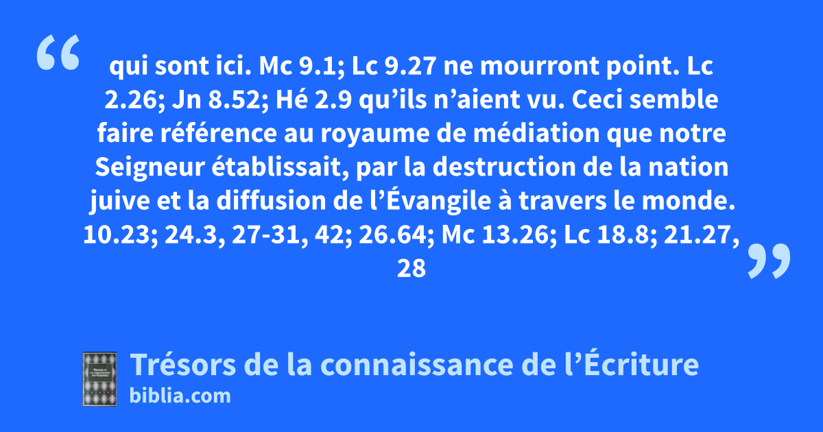 qui sont ici. Mc 9.1; Lc 9.27 ne mourront point. Lc 2.26; Jn 8.52; Hé 2.9 qu’ils n’aient vu. Ceci semble faire référence au royaume de médiation que notre Seigneur établissait, par la destruction de la nation juive et la diffusion de l’Évangile à travers le monde. 10.23; 24.3, 27-31, 42; 26.64; Mc 13.26; Lc 18.8; 21.27, 28