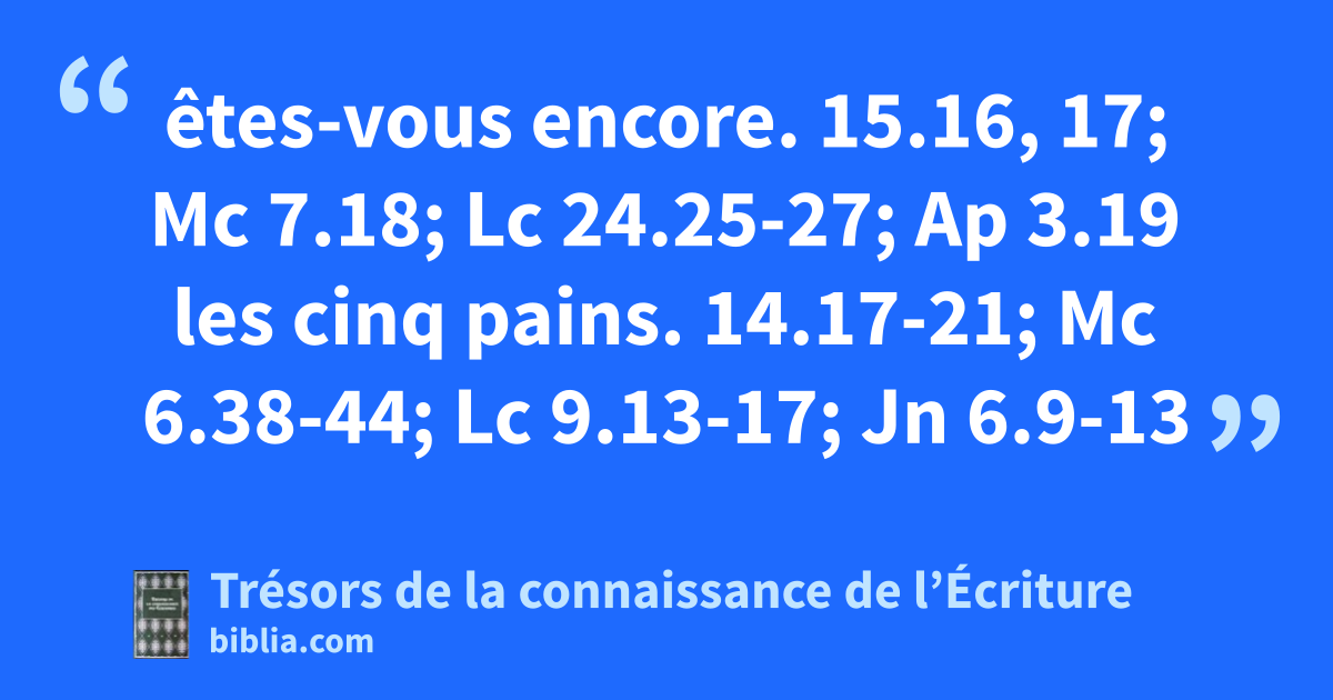 êtes-vous encore. 15.16, 17; Mc 7.18; Lc 24.25-27; Ap 3.19 les cinq pains. 14.17-21; Mc 6.38-44; Lc 9.13-17; Jn 6.9-13