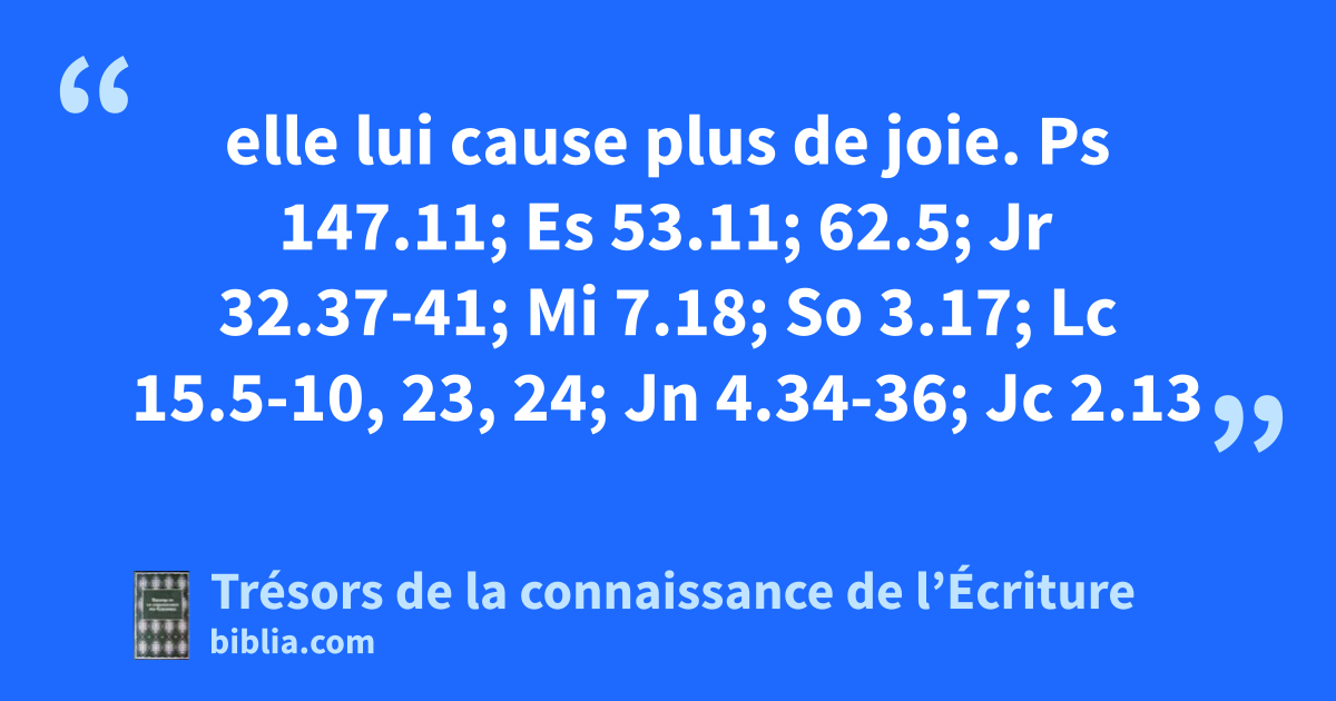 elle lui cause plus de joie. Ps 147.11; Es 53.11; 62.5; Jr 32.37-41; Mi 7.18; So 3.17; Lc 15.5-10, 23, 24; Jn 4.34-36; Jc 2.13
