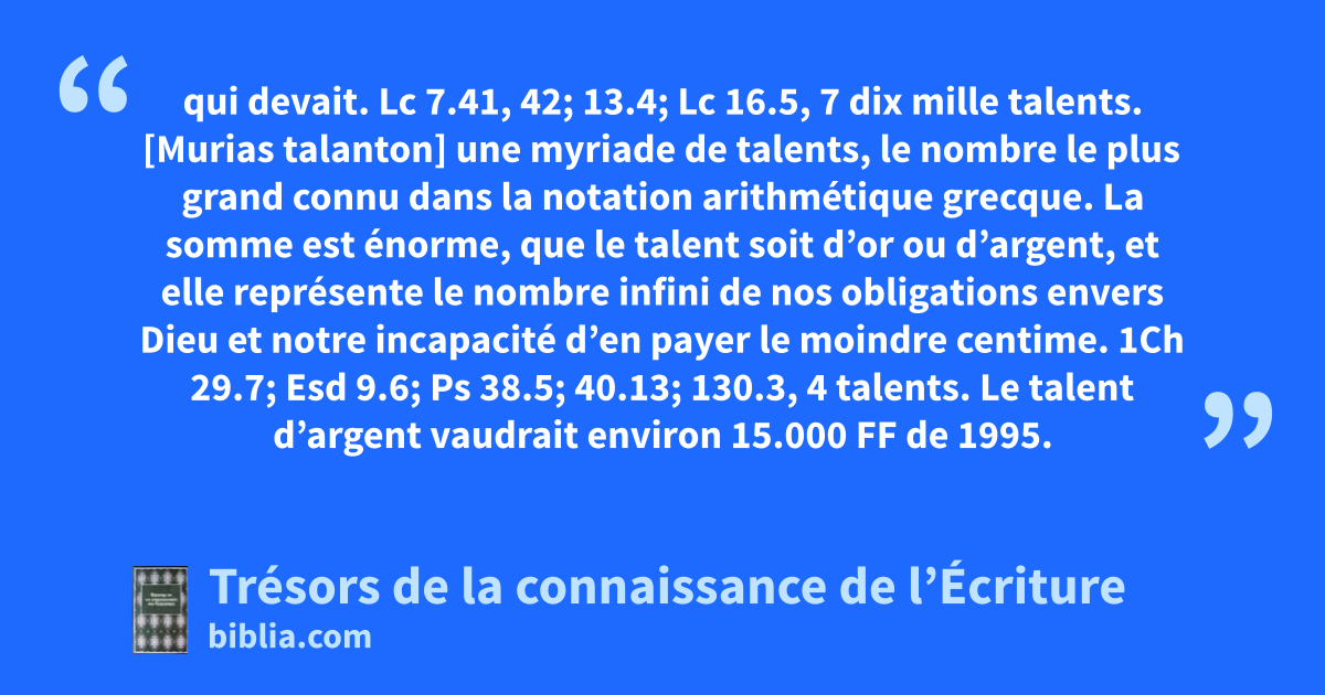 qui devait. Lc 7.41, 42; 13.4; Lc 16.5, 7 dix mille talents. [Murias talanton] une myriade de talents, le nombre le plus grand connu dans la notation arithmétique grecque. La somme est énorme, que le talent soit d’or ou d’argent, et elle représente le nombre infini de nos obligations envers Dieu et notre incapacité d’en payer le moindre centime. 1Ch 29.7; Esd 9.6; Ps 38.5; 40.13; 130.3, 4 talents. Le talent d’argent vaudrait environ 15.000 FF de 1995.