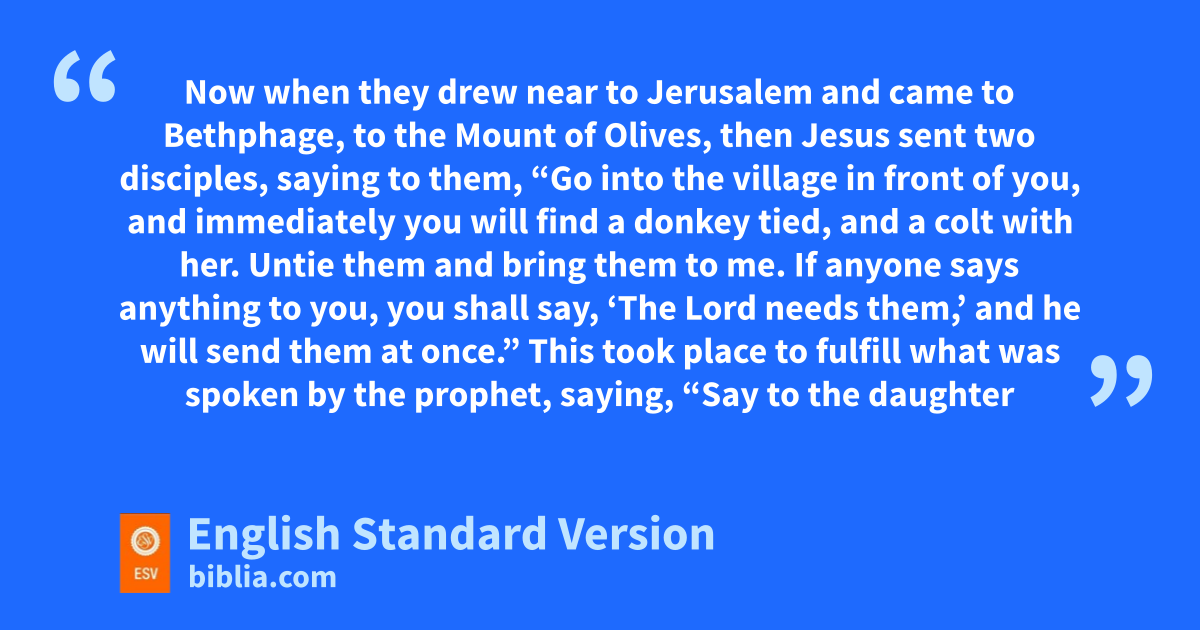 21 qNow when they drew near to Jerusalem and came to Bethphage, to rthe Mount of Olives, then Jesus ssent two disciples, 2 saying to them, “Go into the village in front of you, and immediately you will find a donkey tied, and a colt with her. Untie them and bring them to me. 3 If anyone says anything to you, you shall say, ‘The Lord needs them,’ and he will send them at once.” 4 This took place tto fulfill what was spoken by the prophet, saying,