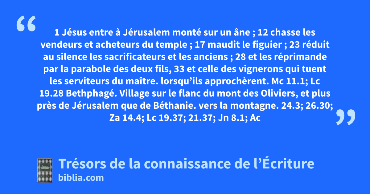 1 Jésus entre à Jérusalem monté sur un âne ; 12 chasse les vendeurs et acheteurs du temple ; 17 maudit le figuier ; 23 réduit au silence les sacrificateurs et les anciens ; 28 et les réprimande par la parabole des deux fils, 33 et celle des vignerons qui tuent les serviteurs du maître.