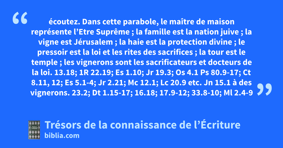 écoutez. Dans cette parabole, le maître de maison représente l’Etre Suprême ; la famille est la nation juive ; la vigne est Jérusalem ; la haie est la protection divine ; le pressoir est la loi et les rites des sacrifices ; la tour est le temple ; les vignerons sont les sacrificateurs et docteurs de la loi. 13.18; 1R 22.19; Es 1.10; Jr 19.3; Os 4.1 Ps 80.9-17; Ct 8.11, 12; Es 5.1-4; Jr 2.21; Mc 12.1; Lc 20.9 etc. Jn 15.1 à des vignerons. 23.2; Dt 1.15-17; 16.18; 17.9-12; 33.8-10; Ml 2.4-9 et quitta le pays. 25.14, 15; Mc 13.34; Lc 19.12