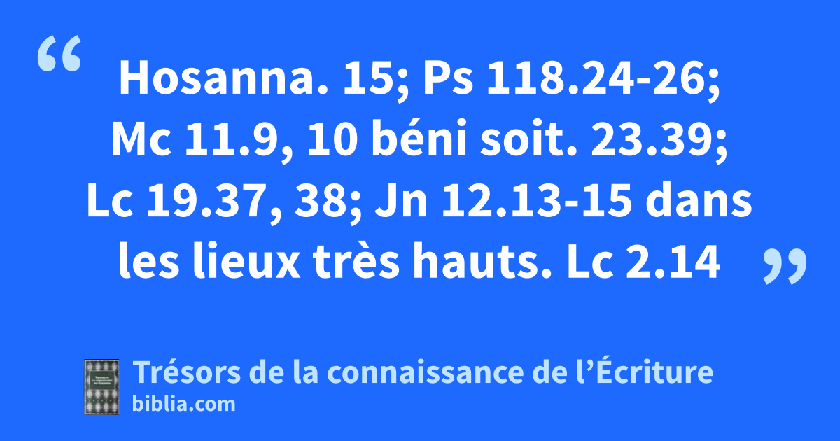 Hosanna. 15; Ps 118.24-26; Mc 11.9, 10 béni soit. 23.39; Lc 19.37, 38; Jn 12.13-15 dans les lieux très hauts. Lc 2.14
