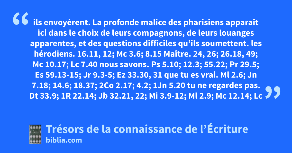 ils envoyèrent. La profonde malice des pharisiens apparaît ici dans le choix de leurs compagnons, de leurs louanges apparentes, et des questions difficiles qu’ils soumettent. les hérodiens. 16.11, 12; Mc 3.6; 8.15 Maître. 24, 26; 26.18, 49; Mc 10.17; Lc 7.40 nous savons. Ps 5.10; 12.3; 55.22; Pr 29.5; Es 59.13-15; Jr 9.3-5; Ez 33.30, 31 que tu es vrai. Ml 2.6; Jn 7.18; 14.6; 18.37; 2Co 2.17; 4.2; 1Jn 5.20 tu ne regardes pas. Dt 33.9; 1R 22.14; Jb 32.21, 22; Mi 3.9-12; Ml 2.9; Mc 12.14; Lc 20.21; 2Co 5.16; Ga 1.10; 2.6; 1Th 2.4; Jc 3.17