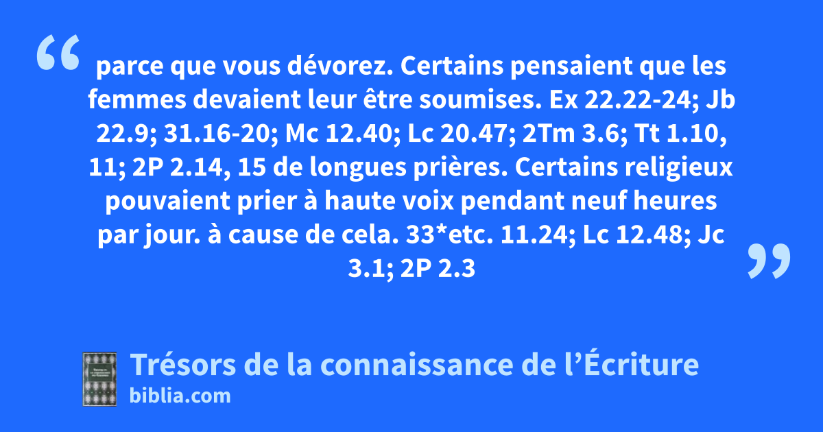 parce que vous dévorez. Certains pensaient que les femmes devaient leur être soumises. Ex 22.22-24; Jb 22.9; 31.16-20; Mc 12.40; Lc 20.47; 2Tm 3.6; Tt 1.10, 11; 2P 2.14, 15 de longues prières. Certains religieux pouvaient prier à haute voix pendant neuf heures par jour. à cause de cela. 33*etc. 11.24; Lc 12.48; Jc 3.1; 2P 2.3