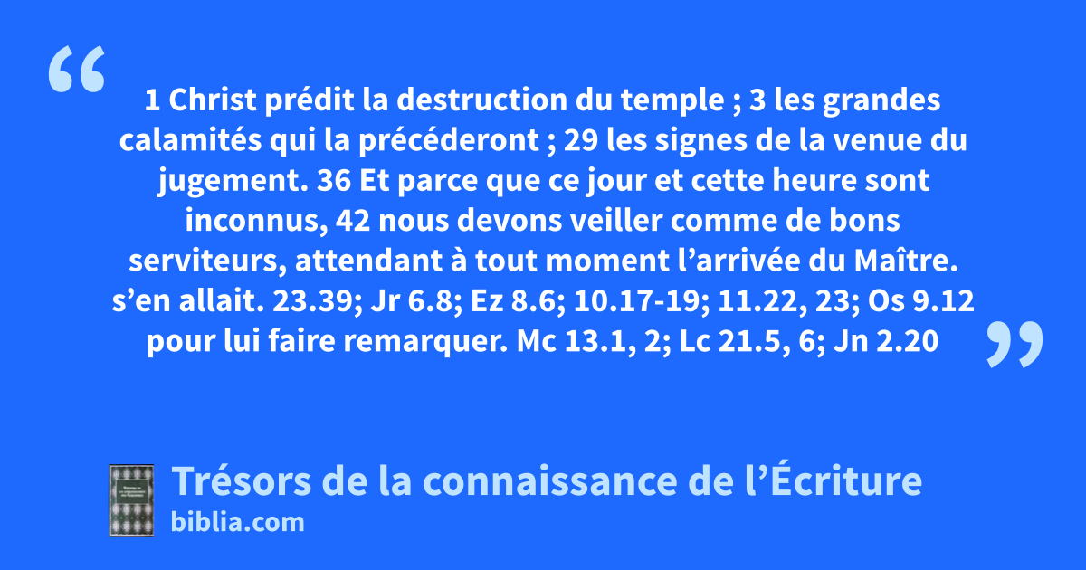 1 Christ prédit la destruction du temple ; 3 les grandes calamités qui la précéderont ; 29 les signes de la venue du jugement. 36 Et parce que ce jour et cette heure sont inconnus, 42 nous devons veiller comme de bons serviteurs, attendant à tout moment l’arrivée du Maître.