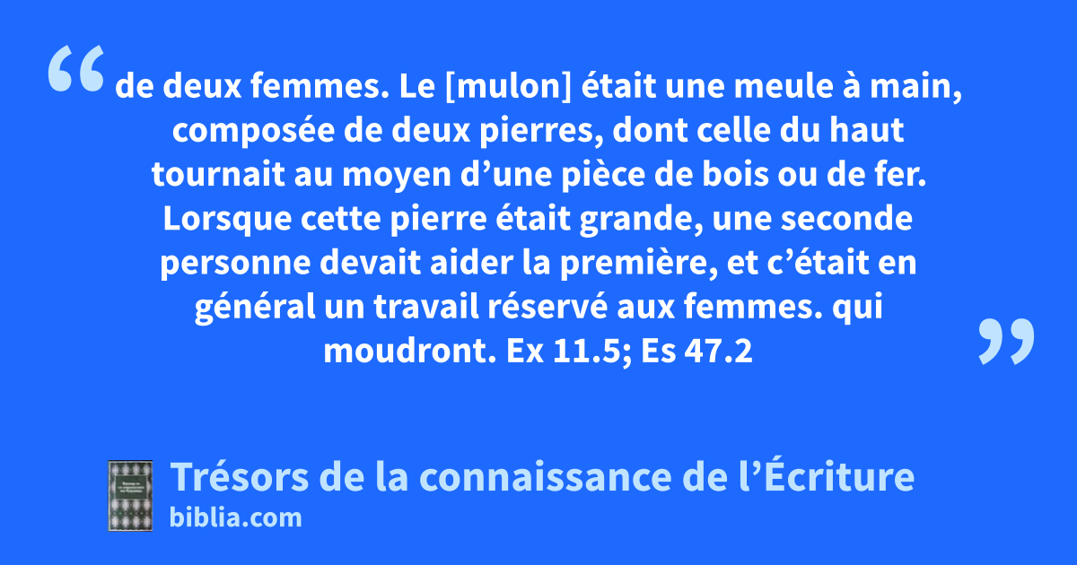 de deux femmes. Le [mulon] était une meule à main, composée de deux pierres, dont celle du haut tournait au moyen d’une pièce de bois ou de fer. Lorsque cette pierre était grande, une seconde personne devait aider la première, et c’était en général un travail réservé aux femmes. qui moudront. Ex 11.5; Es 47.2