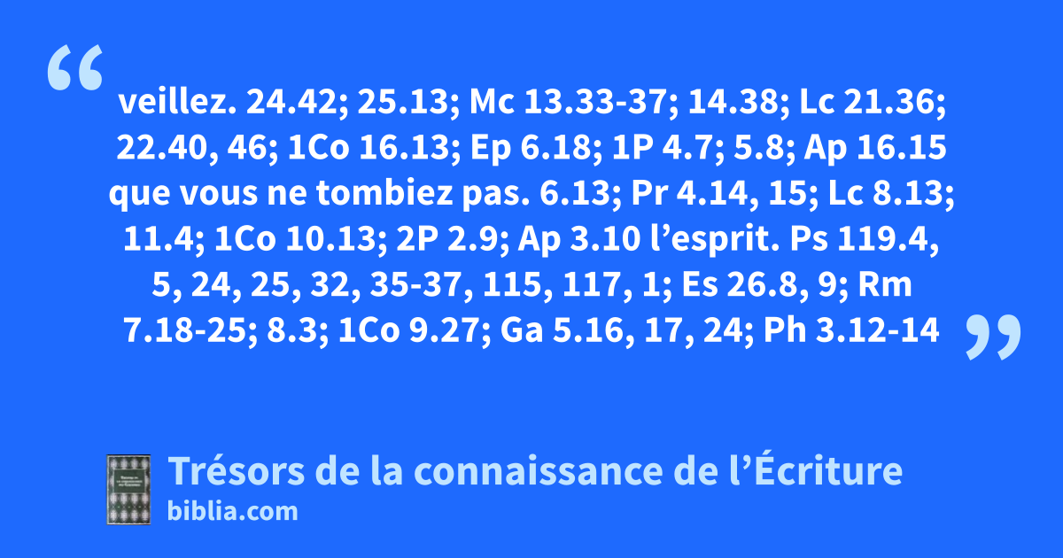 veillez. 24.42; 25.13; Mc 13.33-37; 14.38; Lc 21.36; 22.40, 46; 1Co 16.13; Ep 6.18; 1P 4.7; 5.8; Ap 16.15 que vous ne tombiez pas. 6.13; Pr 4.14, 15; Lc 8.13; 11.4; 1Co 10.13; 2P 2.9; Ap 3.10 l’esprit. Ps 119.4, 5, 24, 25, 32, 35-37, 115, 117, 1; Es 26.8, 9; Rm 7.18-25; 8.3; 1Co 9.27; Ga 5.16, 17, 24; Ph 3.12-14
