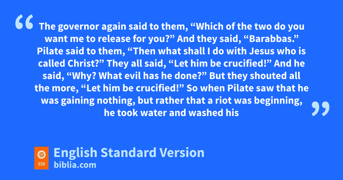 15 qNow at the feast the governor was accustomed to release for the crowd any one prisoner whom they wanted. 16 And they had then a notorious prisoner called Barabbas. 17 So when they had gathered, Pilate said to them, “Whom do you want me to release for you: Barabbas, or rJesus who is called Christ?” 18 For he knew that it was out sof envy that they had delivered him up. 19 Besides, while he was sitting on tthe judgment seat, his wife sent word to him, “Have nothing to do with uthat righteous man, for I have suffered much because of him today vin a dream.” 20 Now the chief priests and the elders persuaded the crowd to wask for Barabbas and destroy Jesus. 21 The governor again said to them, “Which of the two do you want me to release for you?” And they said, “Barabbas.” 22 Pilate said to them, “Then what shall I do with Jesus who is called Christ?” xThey all said, “Let him be crucified!” 23 And he said, “Why? yWhat evil has he done?” But they shouted all the more, “Let him be crucified!”