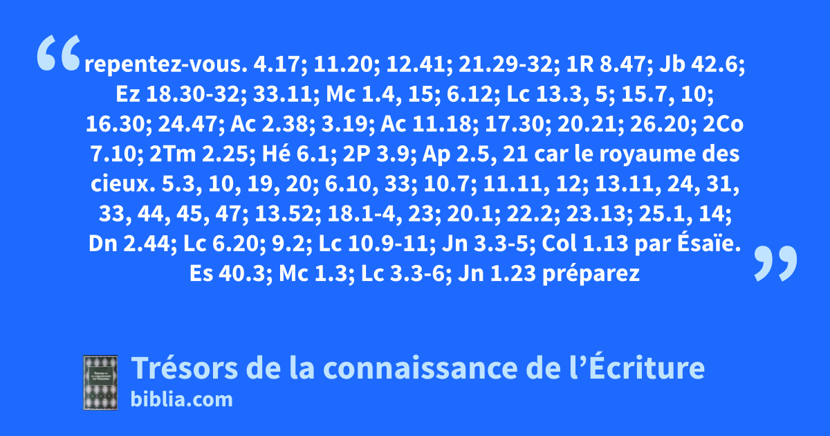 repentez-vous. 4.17; 11.20; 12.41; 21.29-32; 1R 8.47; Jb 42.6; Ez 18.30-32; 33.11; Mc 1.4, 15; 6.12; Lc 13.3, 5; 15.7, 10; 16.30; 24.47; Ac 2.38; 3.19; Ac 11.18; 17.30; 20.21; 26.20; 2Co 7.10; 2Tm 2.25; Hé 6.1; 2P 3.9; Ap 2.5, 21 car le royaume des cieux. 5.3, 10, 19, 20; 6.10, 33; 10.7; 11.11, 12; 13.11, 24, 31, 33, 44, 45, 47; 13.52; 18.1-4, 23; 20.1; 22.2; 23.13; 25.1, 14; Dn 2.44; Lc 6.20; 9.2; Lc 10.9-11; Jn 3.3-5; Col 1.13