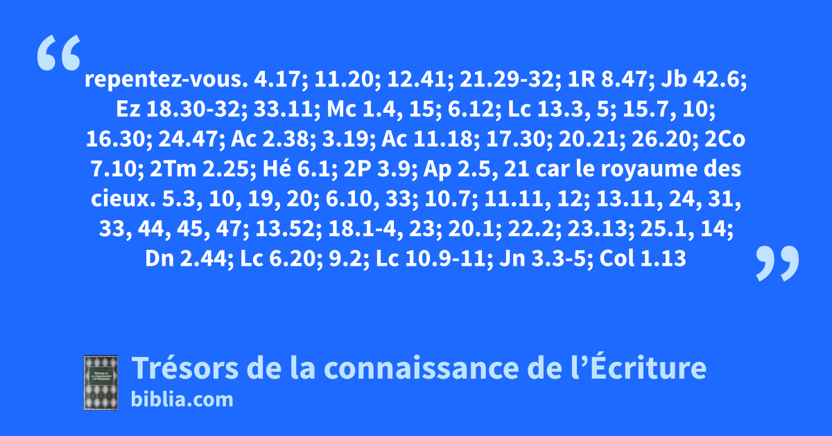 repentez-vous. 4.17; 11.20; 12.41; 21.29-32; 1R 8.47; Jb 42.6; Ez 18.30-32; 33.11; Mc 1.4, 15; 6.12; Lc 13.3, 5; 15.7, 10; 16.30; 24.47; Ac 2.38; 3.19; Ac 11.18; 17.30; 20.21; 26.20; 2Co 7.10; 2Tm 2.25; Hé 6.1; 2P 3.9; Ap 2.5, 21 car le royaume des cieux. 5.3, 10, 19, 20; 6.10, 33; 10.7; 11.11, 12; 13.11, 24, 31, 33, 44, 45, 47; 13.52; 18.1-4, 23; 20.1; 22.2; 23.13; 25.1, 14; Dn 2.44; Lc 6.20; 9.2; Lc 10.9-11; Jn 3.3-5; Col 1.13