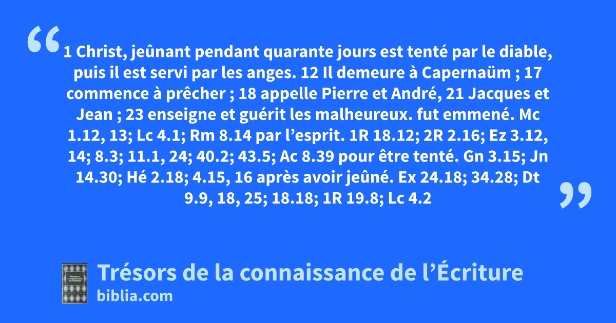 1 Christ, jeûnant pendant quarante jours est tenté par le diable, puis il est servi par les anges. 12 Il demeure à Capernaüm ; 17 commence à prêcher ; 18 appelle Pierre et André, 21 Jacques et Jean ; 23 enseigne et guérit les malheureux.