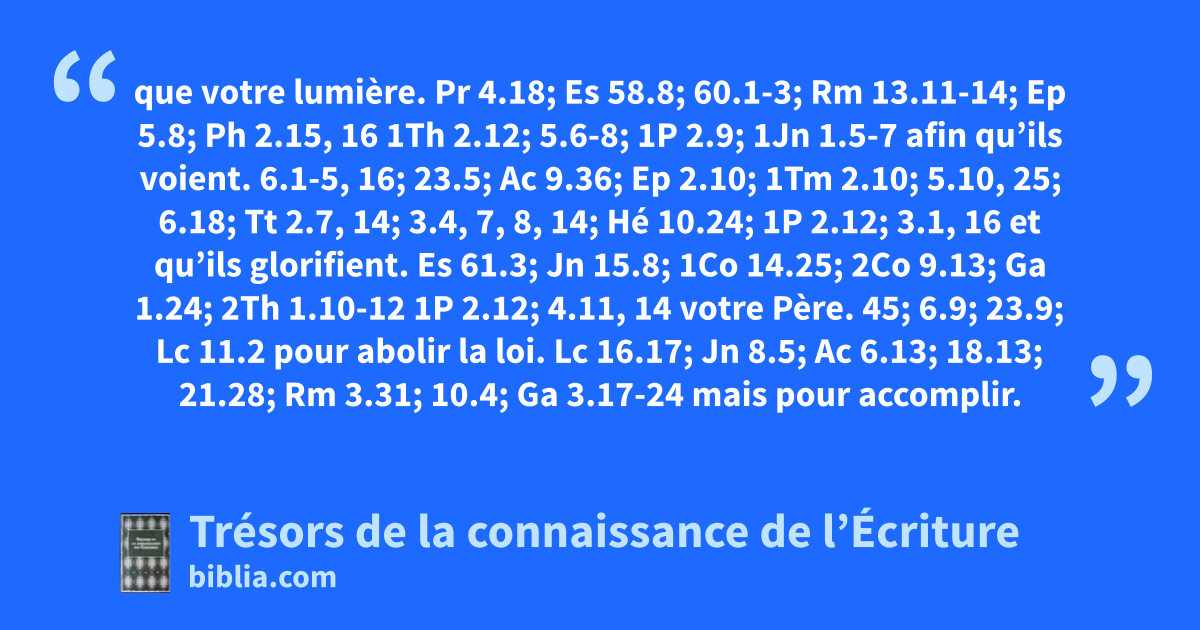 que votre lumière. Pr 4.18; Es 58.8; 60.1-3; Rm 13.11-14; Ep 5.8; Ph 2.15, 16 1Th 2.12; 5.6-8; 1P 2.9; 1Jn 1.5-7 afin qu’ils voient. 6.1-5, 16; 23.5; Ac 9.36; Ep 2.10; 1Tm 2.10; 5.10, 25; 6.18; Tt 2.7, 14; 3.4, 7, 8, 14; Hé 10.24; 1P 2.12; 3.1, 16 et qu’ils glorifient. Es 61.3; Jn 15.8; 1Co 14.25; 2Co 9.13; Ga 1.24; 2Th 1.10-12 1P 2.12; 4.11, 14 votre Père. 45; 6.9; 23.9; Lc 11.2