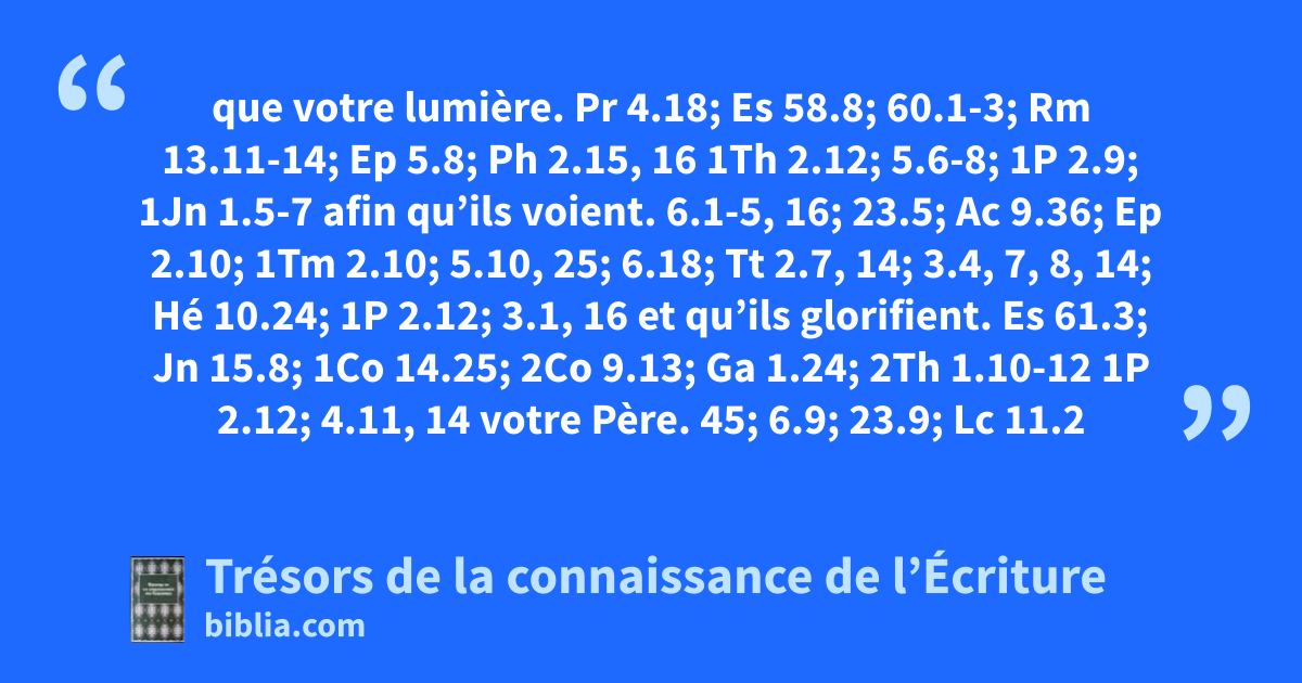 que votre lumière. Pr 4.18; Es 58.8; 60.1-3; Rm 13.11-14; Ep 5.8; Ph 2.15, 16 1Th 2.12; 5.6-8; 1P 2.9; 1Jn 1.5-7 afin qu’ils voient. 6.1-5, 16; 23.5; Ac 9.36; Ep 2.10; 1Tm 2.10; 5.10, 25; 6.18; Tt 2.7, 14; 3.4, 7, 8, 14; Hé 10.24; 1P 2.12; 3.1, 16 et qu’ils glorifient. Es 61.3; Jn 15.8; 1Co 14.25; 2Co 9.13; Ga 1.24; 2Th 1.10-12 1P 2.12; 4.11, 14 votre Père. 45; 6.9; 23.9; Lc 11.2
