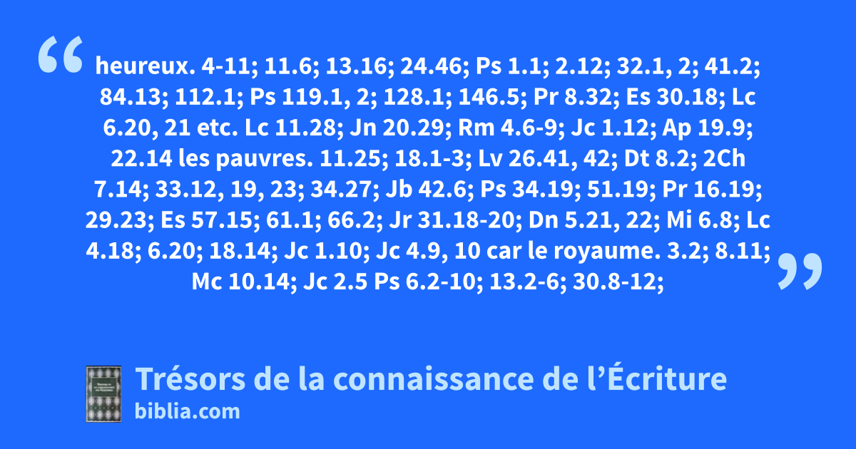 heureux. 4-11; 11.6; 13.16; 24.46; Ps 1.1; 2.12; 32.1, 2; 41.2; 84.13; 112.1; Ps 119.1, 2; 128.1; 146.5; Pr 8.32; Es 30.18; Lc 6.20, 21 etc. Lc 11.28; Jn 20.29; Rm 4.6-9; Jc 1.12; Ap 19.9; 22.14 les pauvres. 11.25; 18.1-3; Lv 26.41, 42; Dt 8.2; 2Ch 7.14; 33.12, 19, 23; 34.27; Jb 42.6; Ps 34.19; 51.19; Pr 16.19; 29.23; Es 57.15; 61.1; 66.2; Jr 31.18-20; Dn 5.21, 22; Mi 6.8; Lc 4.18; 6.20; 18.14; Jc 1.10; Jc 4.9, 10 car le royaume. 3.2; 8.11; Mc 10.14; Jc 2.5
