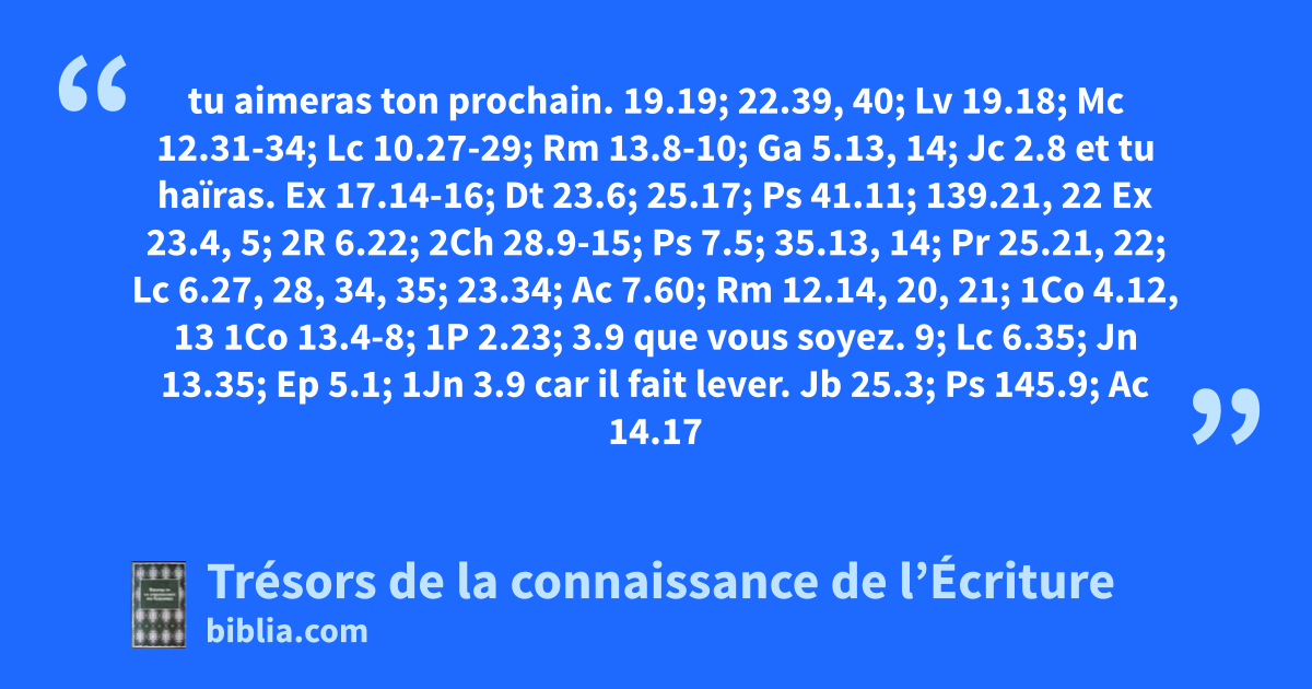 tu aimeras ton prochain. 19.19; 22.39, 40; Lv 19.18; Mc 12.31-34; Lc 10.27-29; Rm 13.8-10; Ga 5.13, 14; Jc 2.8 et tu haïras. Ex 17.14-16; Dt 23.6; 25.17; Ps 41.11; 139.21, 22