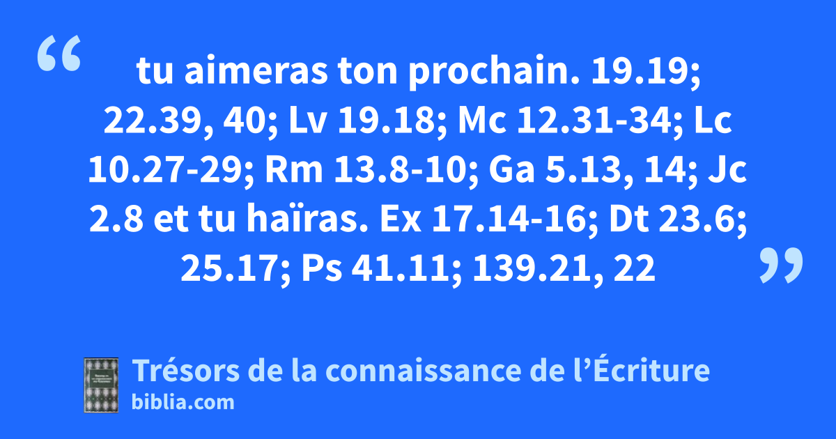 tu aimeras ton prochain. 19.19; 22.39, 40; Lv 19.18; Mc 12.31-34; Lc 10.27-29; Rm 13.8-10; Ga 5.13, 14; Jc 2.8 et tu haïras. Ex 17.14-16; Dt 23.6; 25.17; Ps 41.11; 139.21, 22