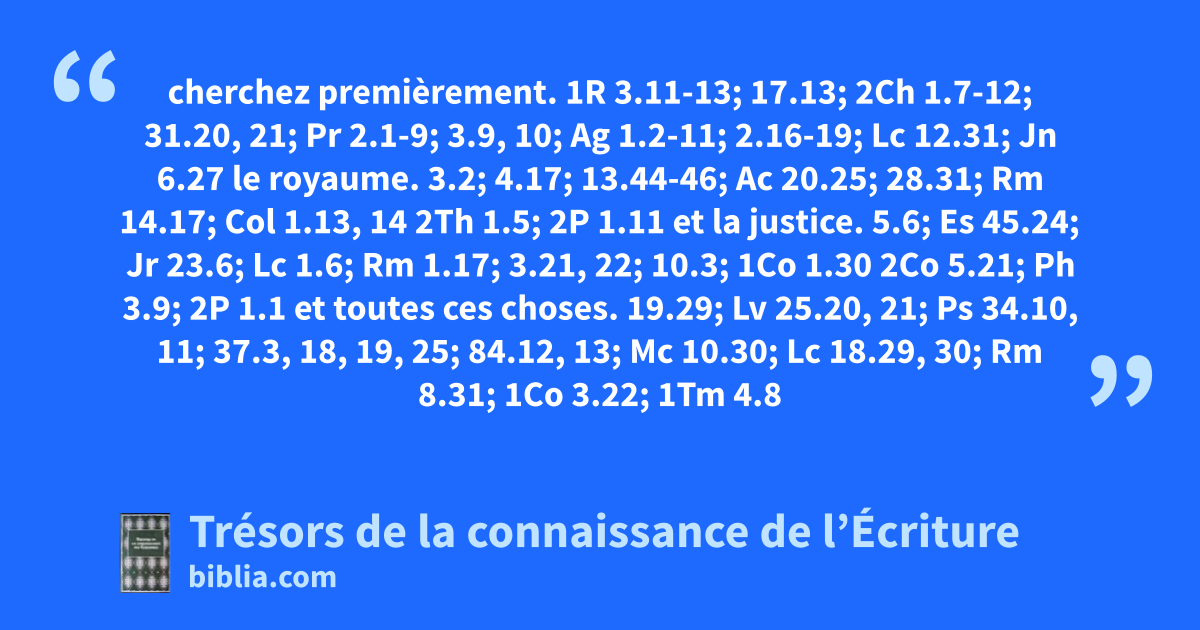 cherchez premièrement. 1R 3.11-13; 17.13; 2Ch 1.7-12; 31.20, 21; Pr 2.1-9; 3.9, 10; Ag 1.2-11; 2.16-19; Lc 12.31; Jn 6.27 le royaume. 3.2; 4.17; 13.44-46; Ac 20.25; 28.31; Rm 14.17; Col 1.13, 14 2Th 1.5; 2P 1.11 et la justice. 5.6; Es 45.24; Jr 23.6; Lc 1.6; Rm 1.17; 3.21, 22; 10.3; 1Co 1.30 2Co 5.21; Ph 3.9; 2P 1.1 et toutes ces choses. 19.29; Lv 25.20, 21; Ps 34.10, 11; 37.3, 18, 19, 25; 84.12, 13; Mc 10.30; Lc 18.29, 30; Rm 8.31; 1Co 3.22; 1Tm 4.8