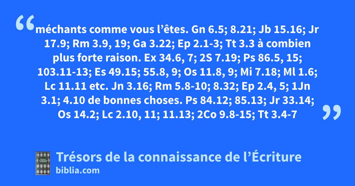 méchants comme vous l’êtes. Gn 6.5; 8.21; Jb 15.16; Jr 17.9; Rm 3.9, 19; Ga 3.22; Ep 2.1-3; Tt 3.3 à combien plus forte raison. Ex 34.6, 7; 2S 7.19; Ps 86.5, 15; 103.11-13; Es 49.15; 55.8, 9; Os 11.8, 9; Mi 7.18; Ml 1.6; Lc 11.11 etc. Jn 3.16; Rm 5.8-10; 8.32; Ep 2.4, 5; 1Jn 3.1; 4.10 de bonnes choses. Ps 84.12; 85.13; Jr 33.14; Os 14.2; Lc 2.10, 11; 11.13; 2Co 9.8-15; Tt 3.4-7