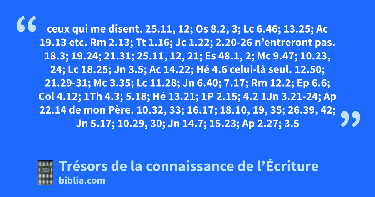 ceux qui me disent. 25.11, 12; Os 8.2, 3; Lc 6.46; 13.25; Ac 19.13 etc. Rm 2.13; Tt 1.16; Jc 1.22; 2.20-26 n’entreront pas. 18.3; 19.24; 21.31; 25.11, 12, 21; Es 48.1, 2; Mc 9.47; 10.23, 24; Lc 18.25; Jn 3.5; Ac 14.22; Hé 4.6 celui-là seul. 12.50; 21.29-31; Mc 3.35; Lc 11.28; Jn 6.40; 7.17; Rm 12.2; Ep 6.6; Col 4.12; 1Th 4.3; 5.18; Hé 13.21; 1P 2.15; 4.2 1Jn 3.21-24; Ap 22.14 de mon Père. 10.32, 33; 16.17; 18.10, 19, 35; 26.39, 42; Jn 5.17; 10.29, 30; Jn 14.7; 15.23; Ap 2.27; 3.5