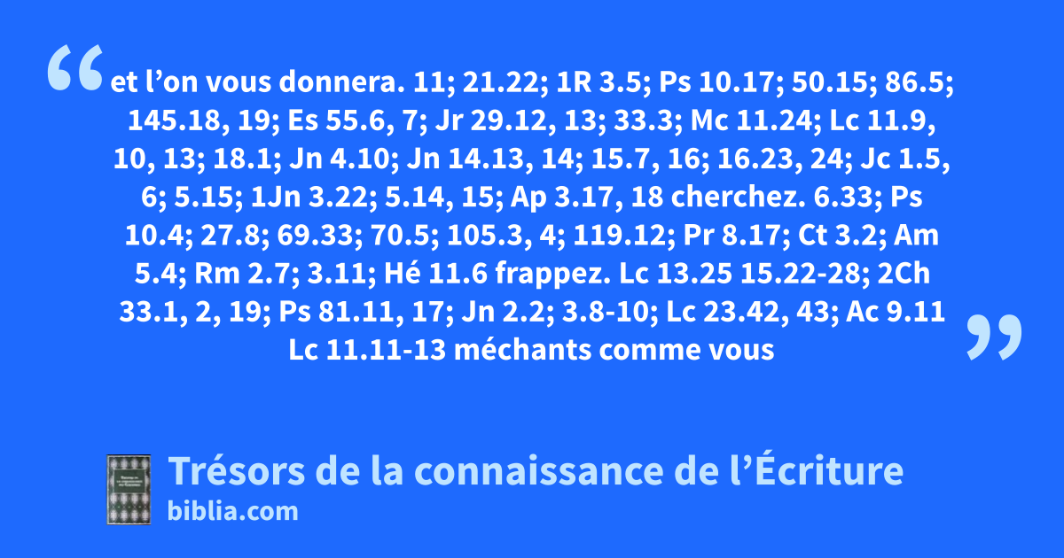 et l’on vous donnera. 11; 21.22; 1R 3.5; Ps 10.17; 50.15; 86.5; 145.18, 19; Es 55.6, 7; Jr 29.12, 13; 33.3; Mc 11.24; Lc 11.9, 10, 13; 18.1; Jn 4.10; Jn 14.13, 14; 15.7, 16; 16.23, 24; Jc 1.5, 6; 5.15; 1Jn 3.22; 5.14, 15; Ap 3.17, 18 cherchez. 6.33; Ps 10.4; 27.8; 69.33; 70.5; 105.3, 4; 119.12; Pr 8.17; Ct 3.2; Am 5.4; Rm 2.7; 3.11; Hé 11.6 frappez. Lc 13.25