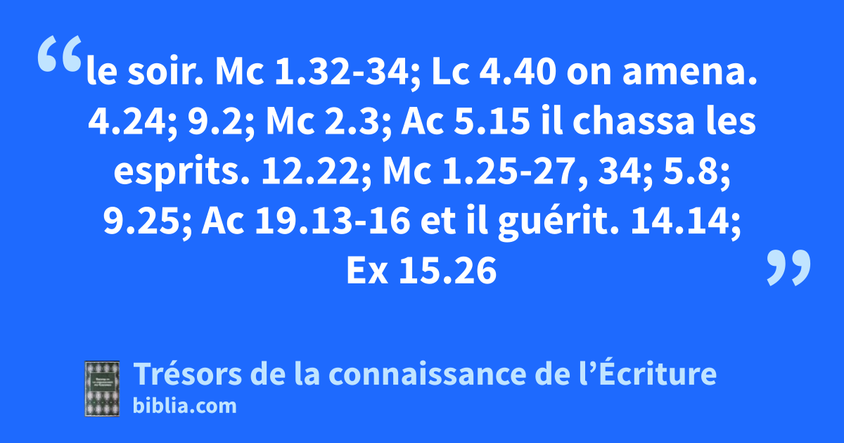 le soir. Mc 1.32-34; Lc 4.40 on amena. 4.24; 9.2; Mc 2.3; Ac 5.15 il chassa les esprits. 12.22; Mc 1.25-27, 34; 5.8; 9.25; Ac 19.13-16 et il guérit. 14.14; Ex 15.26