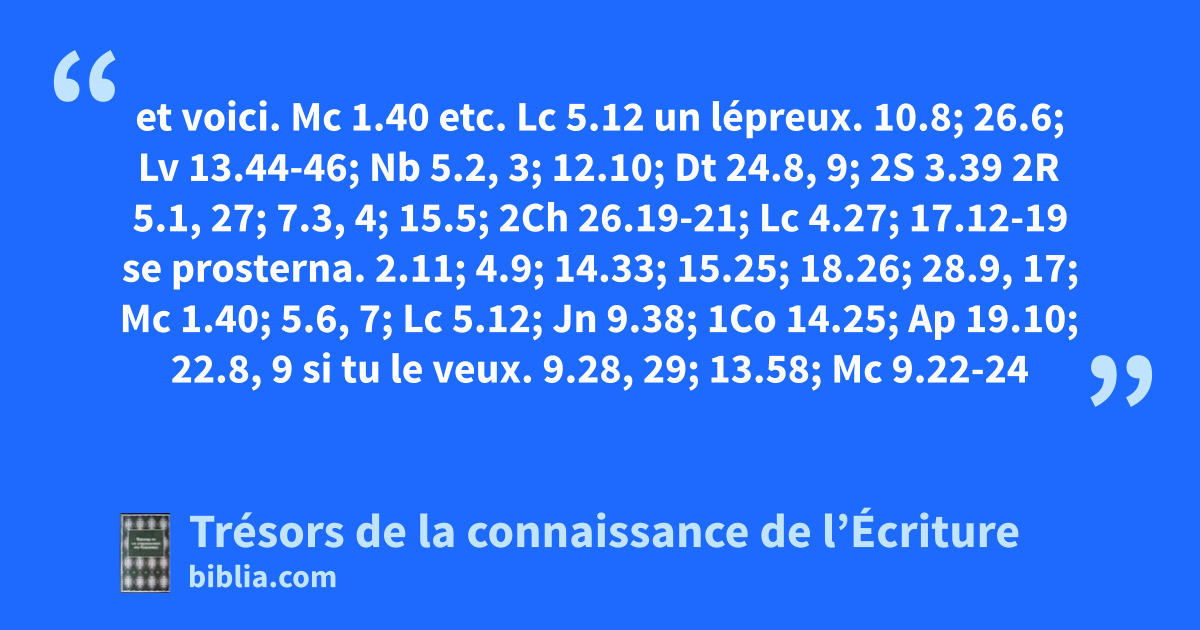 et voici. Mc 1.40 etc. Lc 5.12 un lépreux. 10.8; 26.6; Lv 13.44-46; Nb 5.2, 3; 12.10; Dt 24.8, 9; 2S 3.39 2R 5.1, 27; 7.3, 4; 15.5; 2Ch 26.19-21; Lc 4.27; 17.12-19 se prosterna. 2.11; 4.9; 14.33; 15.25; 18.26; 28.9, 17; Mc 1.40; 5.6, 7; Lc 5.12; Jn 9.38; 1Co 14.25; Ap 19.10; 22.8, 9 si tu le veux. 9.28, 29; 13.58; Mc 9.22-24