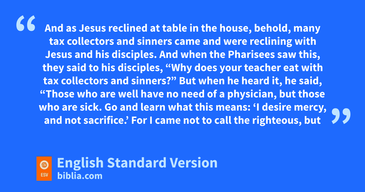 10 And as Jesus2 reclined at table in the house, behold, many gtax collectors and sinners came and were reclining with Jesus and his disciples. 11 And when the Pharisees saw this, they said to his disciples, h“Why does your teacher eat with gtax collectors and sinners?” 12 But when he heard it, he said, “Those who are well have no need of a physician, but those who are sick. 13 Go and learn iwhat this means: j‘I desire mercy, and not sacrifice.’ For kI came not to call the righteous, lbut sinners.”