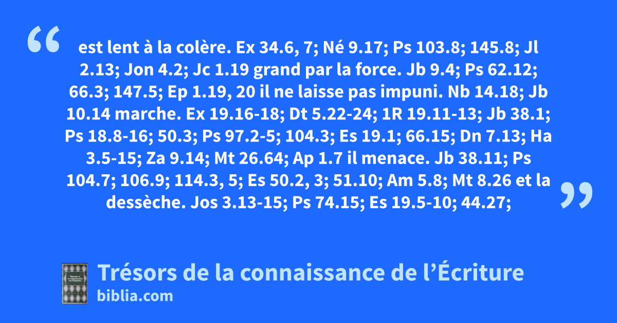 est lent à la colère. Ex 34.6, 7; Né 9.17; Ps 103.8; 145.8; Jl 2.13; Jon 4.2; Jc 1.19 grand par la force. Jb 9.4; Ps 62.12; 66.3; 147.5; Ep 1.19, 20 il ne laisse pas impuni. Nb 14.18; Jb 10.14 marche. Ex 19.16-18; Dt 5.22-24; 1R 19.11-13; Jb 38.1; Ps 18.8-16; 50.3; Ps 97.2-5; 104.3; Es 19.1; 66.15; Dn 7.13; Ha 3.5-15; Za 9.14; Mt 26.64; Ap 1.7
