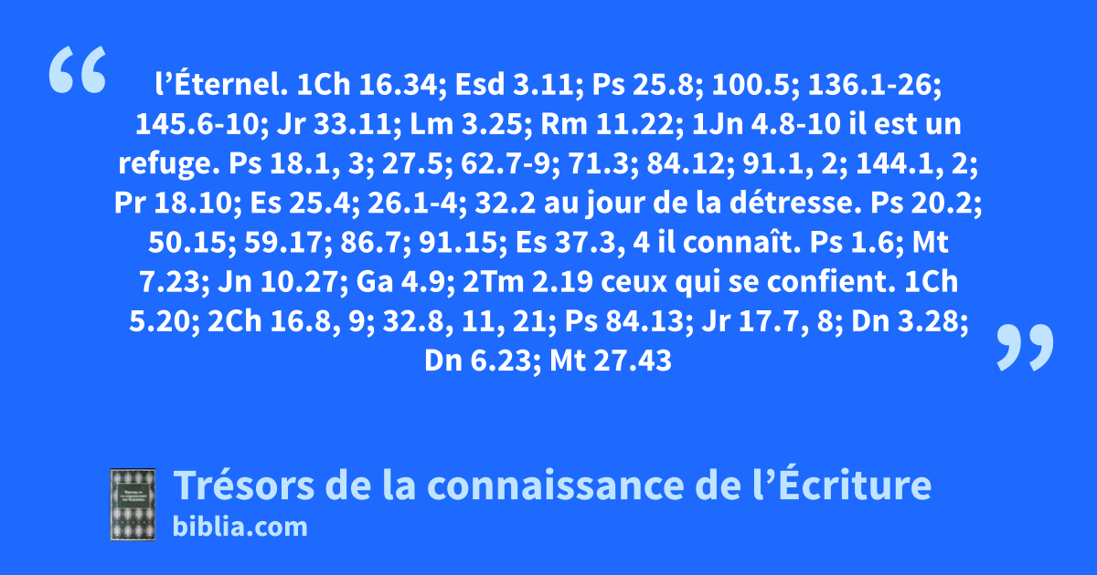 l’Éternel. 1Ch 16.34; Esd 3.11; Ps 25.8; 100.5; 136.1-26; 145.6-10; Jr 33.11; Lm 3.25; Rm 11.22; 1Jn 4.8-10 il est un refuge. Ps 18.1, 3; 27.5; 62.7-9; 71.3; 84.12; 91.1, 2; 144.1, 2; Pr 18.10; Es 25.4; 26.1-4; 32.2 au jour de la détresse. Ps 20.2; 50.15; 59.17; 86.7; 91.15; Es 37.3, 4 il connaît. Ps 1.6; Mt 7.23; Jn 10.27; Ga 4.9; 2Tm 2.19 ceux qui se confient. 1Ch 5.20; 2Ch 16.8, 9; 32.8, 11, 21; Ps 84.13; Jr 17.7, 8; Dn 3.28; Dn 6.23; Mt 27.43
