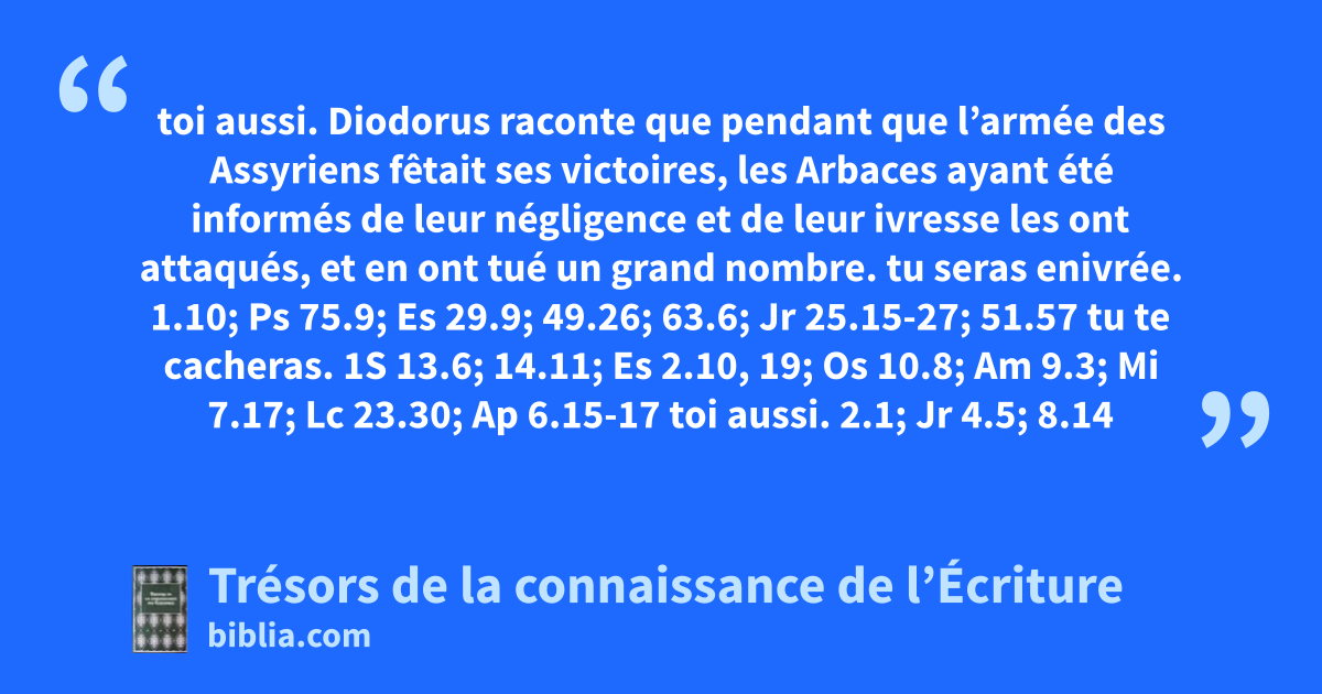 toi aussi. Diodorus raconte que pendant que l’armée des Assyriens fêtait ses victoires, les Arbaces ayant été informés de leur négligence et de leur ivresse les ont attaqués, et en ont tué un grand nombre. tu seras enivrée. 1.10; Ps 75.9; Es 29.9; 49.26; 63.6; Jr 25.15-27; 51.57 tu te cacheras. 1S 13.6; 14.11; Es 2.10, 19; Os 10.8; Am 9.3; Mi 7.17; Lc 23.30; Ap 6.15-17 toi aussi. 2.1; Jr 4.5; 8.14