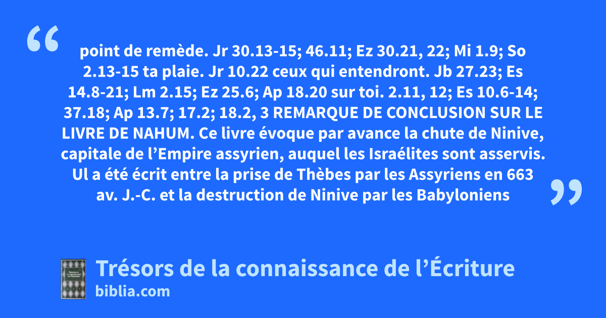point de remède. Jr 30.13-15; 46.11; Ez 30.21, 22; Mi 1.9; So 2.13-15 ta plaie. Jr 10.22 ceux qui entendront. Jb 27.23; Es 14.8-21; Lm 2.15; Ez 25.6; Ap 18.20 sur toi. 2.11, 12; Es 10.6-14; 37.18; Ap 13.7; 17.2; 18.2, 3