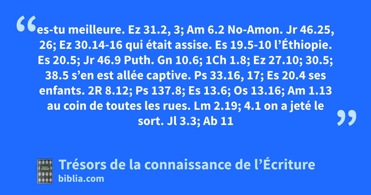es-tu meilleure. Ez 31.2, 3; Am 6.2 No-Amon. Jr 46.25, 26; Ez 30.14-16 qui était assise. Es 19.5-10