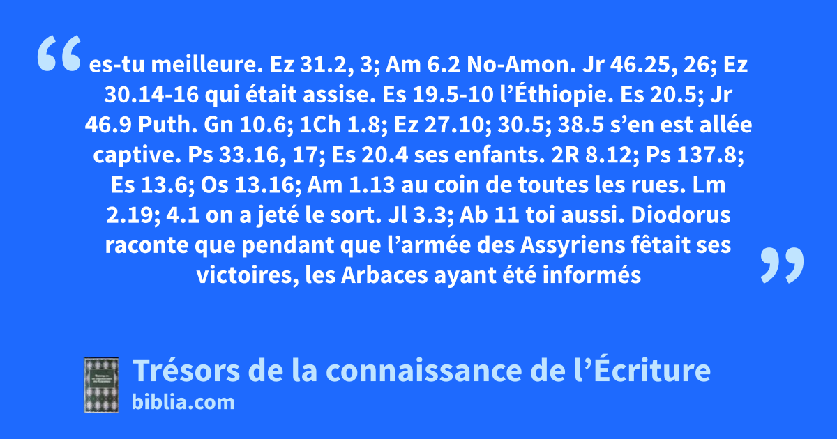 es-tu meilleure. Ez 31.2, 3; Am 6.2 No-Amon. Jr 46.25, 26; Ez 30.14-16 qui était assise. Es 19.5-10