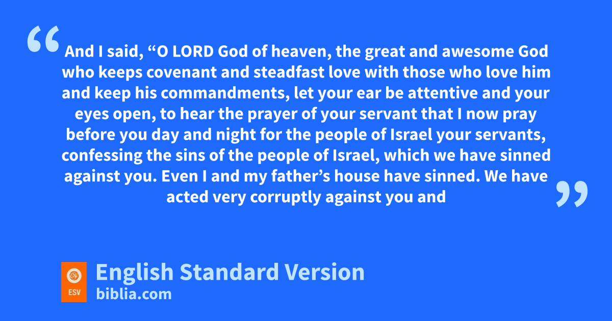 4 As soon as I heard these words I isat down and wept and mourned for days, and I continued fasting and praying before the jGod of heaven. 5 And I said, “O Lord God of heaven, kthe great and awesome God who keeps covenant and steadfast love with those who love him and keep his commandments, 6 llet your ear be attentive and your eyes open, to hear the prayer of your servant that I now pray before you day and night for the people of Israel your servants, mconfessing the sins of the people of Israel, which we have sinned against you. Even nI and my father’s house have sinned. 7 oWe have acted very corruptly against you and have not kept the commandments, the statutes, and the rules pthat you commanded your servant Moses. 8 Remember the word that you commanded your servant Moses, saying, ‘If you are unfaithful, qI will scatter you among the peoples, 9 rbut if you return to me and keep my commandments and do them, sthough your outcasts are in the uttermost parts of heaven, from there I will gather them and bring them tto the place that I have chosen, to make my name dwell there.’ 10 uThey are your servants and your people, whom you have redeemed by your great power and by your strong hand. 11 O Lord, llet your ear be attentive to the prayer of your servant, and to the prayer of your servants who delight to fear your name, and give success to your servant today, and grant him mercy in the sight of this man.”