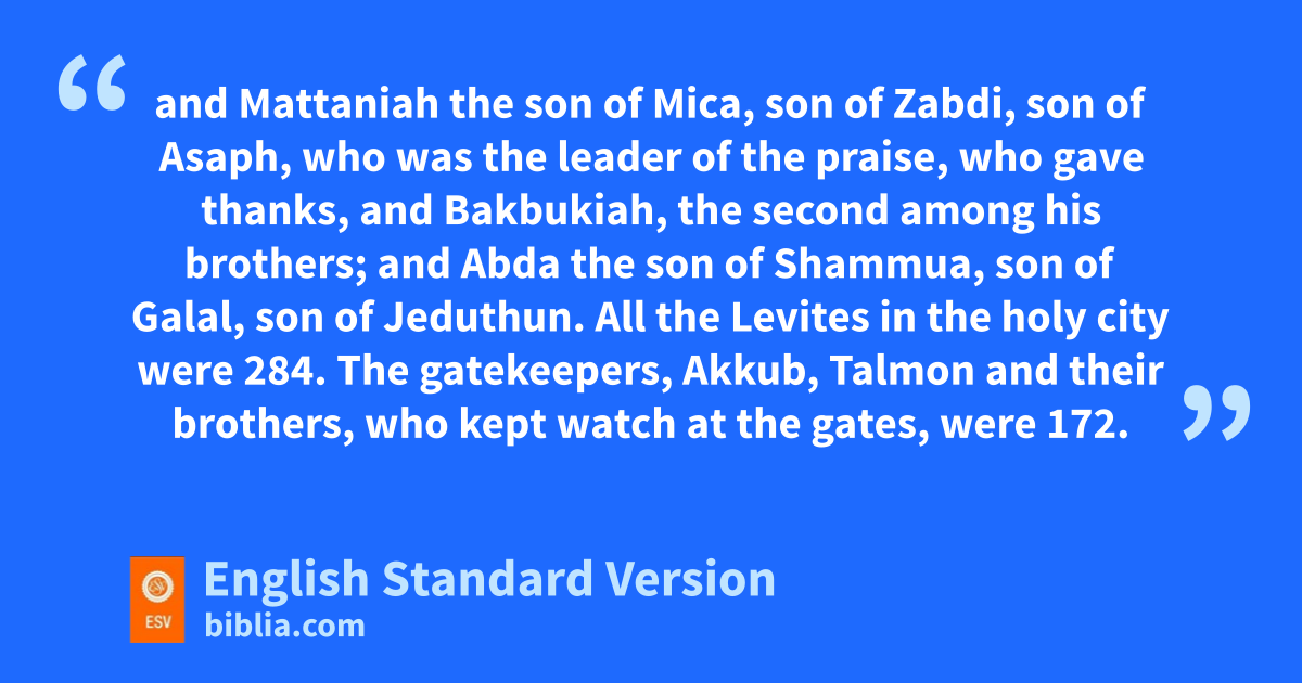 15 And of the Levites: Shemaiah the son of Hasshub, son of Azrikam, son of Hashabiah, son of Bunni; 16 and Shabbethai and qJozabad, of the chiefs of the Levites, who were over rthe outside work of the house of God; 17 and sMattaniah the son of Mica, son of Zabdi, son of Asaph, who was the leader of the praise,3 who gave thanks, and Bakbukiah, the second among his brothers; and Abda the son of Shammua, son of Galal, son of Jeduthun. 18 All the Levites in tthe holy city were 284.