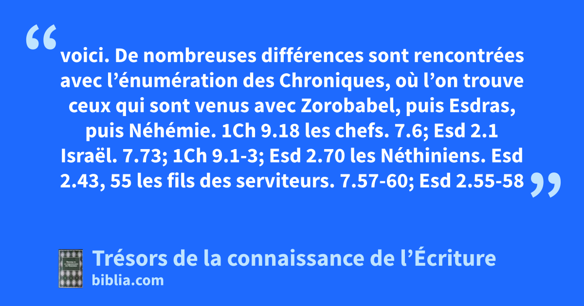 voici. De nombreuses différences sont rencontrées avec l’énumération des Chroniques, où l’on trouve ceux qui sont venus avec Zorobabel, puis Esdras, puis Néhémie. 1Ch 9.18 les chefs. 7.6; Esd 2.1 Israël. 7.73; 1Ch 9.1-3; Esd 2.70 les Néthiniens. Esd 2.43, 55 les fils des serviteurs. 7.57-60; Esd 2.55-58