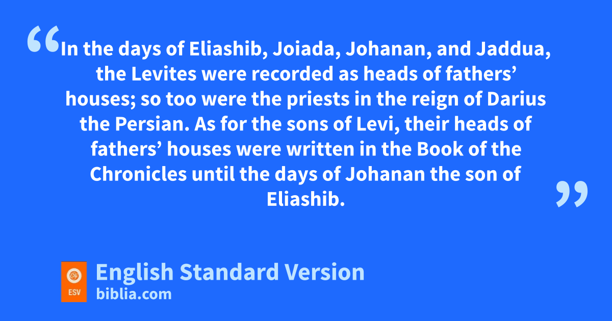 22 In the days of Eliashib, Joiada, Johanan, and Jaddua, the Levites were recorded as heads of fathers’ houses; so too were the priests in the reign of Darius the Persian. 23 As for the sons of Levi, their heads of fathers’ houses iwere written in the Book of the Chronicles until the days of Johanan the son of Eliashib. 24 And the chiefs of the Levites: Hashabiah, Sherebiah, and jJeshua the son of Kadmiel, with their brothers who stood opposite them, kto praise and to give thanks, laccording to the commandment of David mthe man of God, nwatch by watch. 25 Mattaniah, Bakbukiah, Obadiah, Meshullam, Talmon, and Akkub were gatekeepers standing guard at othe storehouses of the gates. 26 These were in the days of Joiakim the son of Jeshua son of Jozadak, and in the days of pNehemiah the governor and of pEzra, the priest and scribe.