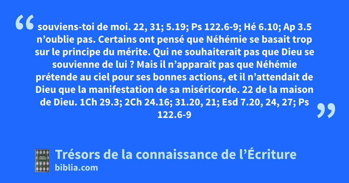 souviens-toi de moi. 22, 31; 5.19; Ps 122.6-9; Hé 6.10; Ap 3.5 n’oublie pas. Certains ont pensé que Néhémie se basait trop sur le principe du mérite. Qui ne souhaiterait pas que Dieu se souvienne de lui ? Mais il n’apparaît pas que Néhémie prétende au ciel pour ses bonnes actions, et il n’attendait de Dieu que la manifestation de sa miséricorde. 22 de la maison de Dieu. 1Ch 29.3; 2Ch 24.16; 31.20, 21; Esd 7.20, 24, 27; Ps 122.6-9