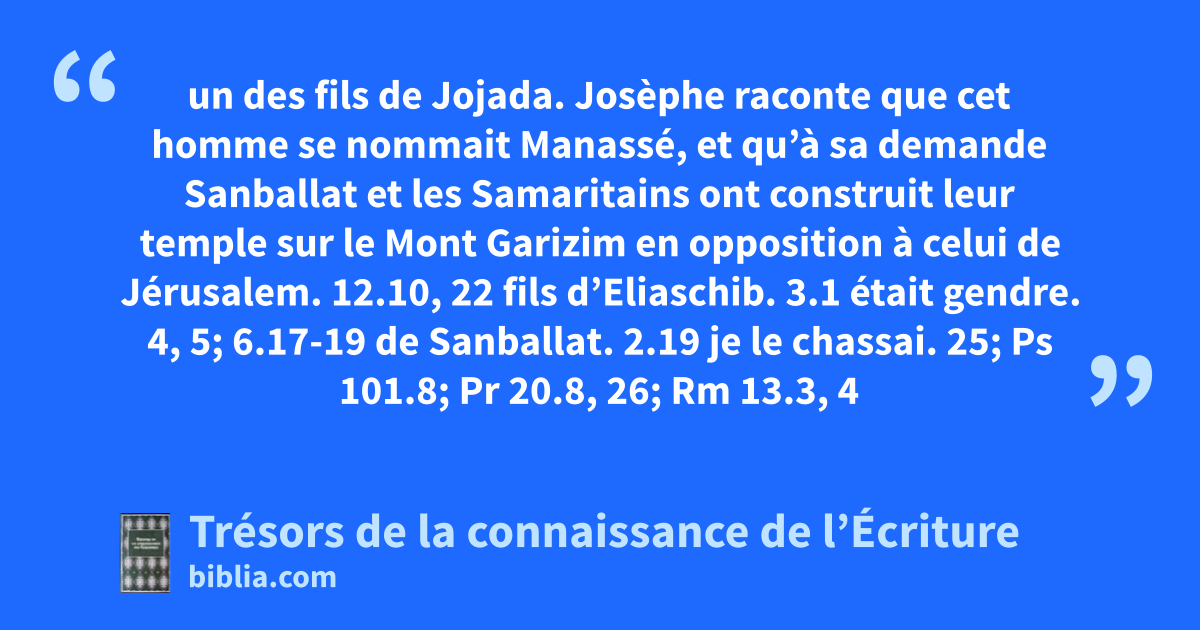 un des fils de Jojada. Josèphe raconte que cet homme se nommait Manassé, et qu’à sa demande Sanballat et les Samaritains ont construit leur temple sur le Mont Garizim en opposition à celui de Jérusalem. 12.10, 22 fils d’Eliaschib. 3.1 était gendre. 4, 5; 6.17-19 de Sanballat. 2.19 je le chassai. 25; Ps 101.8; Pr 20.8, 26; Rm 13.3, 4