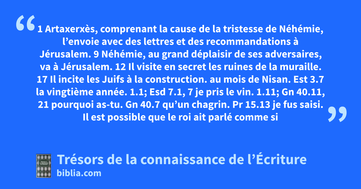1 Artaxerxès, comprenant la cause de la tristesse de Néhémie, l’envoie avec des lettres et des recommandations à Jérusalem.
