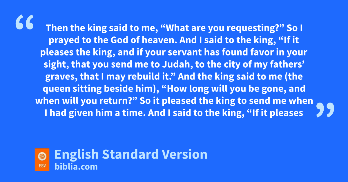 2 In the month of Nisan, win the twentieth year of King xArtaxerxes, when wine was before him, yI took up the wine and gave it to the king. Now I had not been sad in his presence. 2 And the king said to me, “Why is your face sad, seeing you are not sick? This is nothing but zsadness of the heart.” Then I was very much afraid. 3 I said to the king, a“Let the king live forever! Why should not my face be sad, bwhen the city, the place of my fathers’ graves, lies in ruins, and its gates have been destroyed by fire?” 4 Then the king said to me, “What are you requesting?” So I prayed cto the God of heaven. 5 And I said to the king, “If it pleases the king, and if your servant has found favor in your sight, that you send me to Judah, to the city of my fathers’ graves, that I may rebuild it.” 6 And the king said to me (dthe queen sitting beside him), “How long will you be gone, and when will you return?” So it pleased the king to send me ewhen I had given him a time. 7 And I said to the king, “If it pleases the king, let letters be given me fto the governors of the province Beyond the River, that they may let me pass through until I come to Judah, 8 and a letter to Asaph, the keeper of the king’s forest, that he may give me timber to make beams for the gates of gthe fortress of the temple, and for the wall of the city, and for the house that I shall occupy.” And the king granted me what I asked, hfor the good hand of my God was upon me.