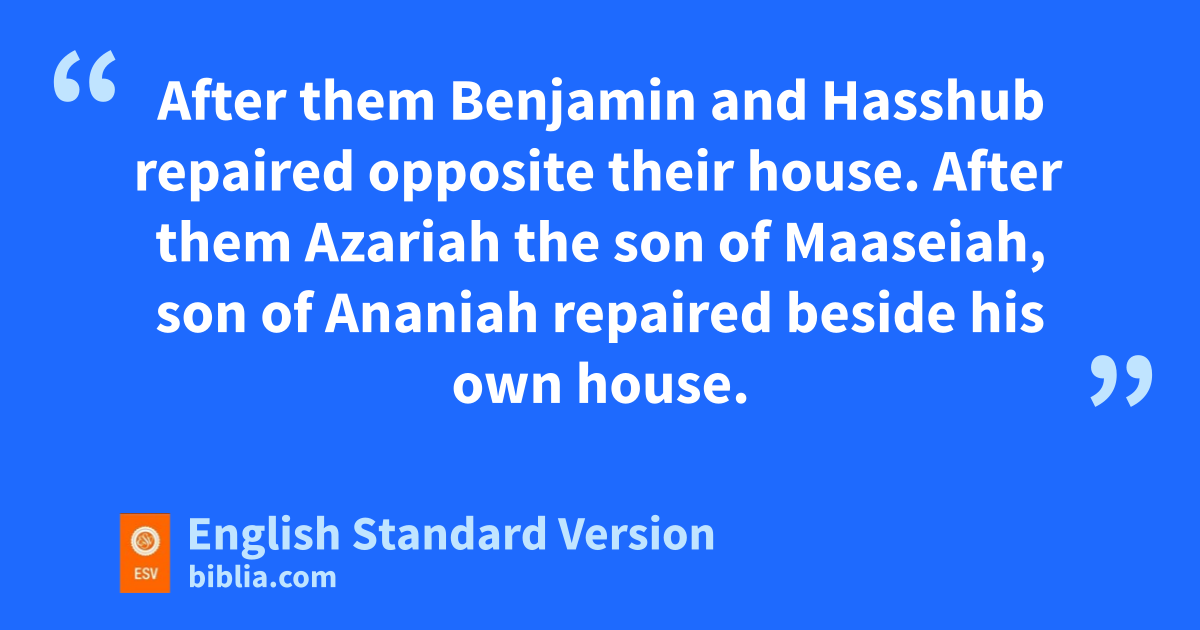 15 And Shallum the son of Col-hozeh, ruler of the district of Mizpah, repaired vthe Fountain Gate. He rebuilt it and covered it and sset its doors, its bolts, and its bars. And he built the wall of wthe Pool of Shelah of xthe king’s garden, as far as ythe stairs that go down from the city of David. 16 After him Nehemiah the son of Azbuk, ruler of half the district of Beth-zur, repaired to a point opposite zthe tombs of David, as far as athe artificial pool, and as far as the house of the mighty men. 17 After him the Levites repaired: Rehum the son of Bani. Next to him Hashabiah, ruler of half the district of Keilah, repaired for his district. 18 After him their brothers repaired: Bavvai the son of Henadad, ruler of half the district of Keilah. 19 Next to him Ezer the son of Jeshua, ruler of Mizpah, repaired another section opposite the ascent to the armory at bthe buttress.6 20 After him Baruch the son of Zabbai repaired7 another section from the buttress to the door of the house of cEliashib the high priest. 21 After him dMeremoth the son of Uriah, son of Hakkoz repaired another section from the door of the house of Eliashib to the end of the house of Eliashib. 22 After him the priests, the men of ethe surrounding area, repaired. 23 After them Benjamin and Hasshub repaired opposite their house. After them Azariah the son of Maaseiah, son of Ananiah repaired beside his own house. 24 After him Binnui the son of Henadad repaired another section, from the house of Azariah to the buttress and to fthe corner.25 Palal the son of Uzai repaired opposite the buttress and the tower projecting from the upper house of the king at gthe court of the guard. After him Pedaiah the son of Parosh 26 hand the temple servants living on iOphel repaired to a point opposite jthe Water Gate on the east and the projecting tower. 27 After him kthe Tekoites repaired another section opposite the great projecting tower as far as the wall of Ophel.